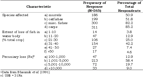 The fish species most severely affected by EUS were predominantly bottom-dwelling fishes, like murrels and air-breathing catfishes; other miscellaneous fishes (Puntius sp., Nandus sp. etc.) were also affected. It is interesting to note that in all ponds under a traditional system of culture where both desirable and undesirable varieties of fish occur, murrels were affected at the first stage of the outbreak, followed by miscellaneous fishes and finally by the carps. In scientifically and semi-scientifically managed ponds where piscicides were used to control predatory fish, the carps were affected at the start of outbreak, since no other fishes were present (Bhaumik et al. 1991). The respondents also reported the presence of the disease in more than one species in their ponds. Thus, the pooled data for traditional, semi-scientific and scientific culture operations (see Table 10) indicate that the effects of EUS were maximal on carps (311 responses), followed by miscellaneous fishes (300 responses), catfishes (191 responses) and murrels (186 responses). The effect on carps appears to be most pronounced here due to the fact that most of the ponds belong to the semi-scientific and scientific management categories where the total population of fish cultured consists of carps, whereas in the traditional system carp comprise only a fraction of the total fish cultured.