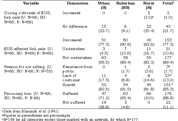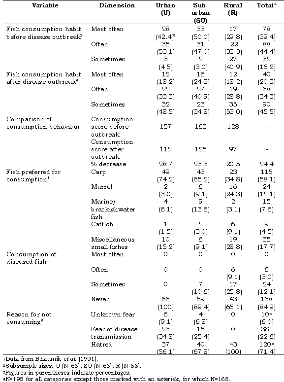 The study revealed that the frequency of fish consumption declined due to the outbreak of EUS. Only 15.1% of the sample consumed diseased fish, with the majority of these respondents belonging to the rural sector. The consumption rate was found to be decreased by 28.7, 23.3 and 20.5% in the urban, suburban and rural sectors, respectively. A maximum number of the respondents who used to consume fish "most often" (78) and "often" (88), changed their habit of fish consumption to "sometimes" (90), and their preference was restricted mainly to healthy carps. Most of the respondents declined to purchase even healthy fish when these were kept along with diseased fish in the markets. Again, excepting rural markets, respondents expressed their apathy towards purchase of diseased fish, even if these were sold at a cheaper rate.