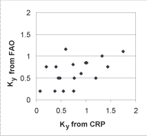 FAO vs. CRP comparisons were possible for 21 pairs of ky values (Table 3). Some crops (cotton, wheat and bean) may be over-represented as they were grown in more than in one country. The t-Test gave a significant difference between the ky pairs at the 1-percent level of probability (and at the 2- percent level with the two-tail distribution).