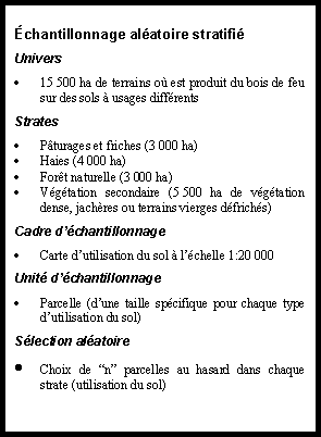 Il existe des critères généraux pour décider s'il convient de faire un échantillonnage stratifié. Dans le groupe de la demande de dendrocombustibles, la saturation et la consommation sont les variables qui doivent déterminer, au premier chef, s'il est opportun de stratifier. Dans le groupe de l'offre directe, la stratification se fait par type de source, de couverture ou d'utilisation du sol. Pour le groupe de l'offre indirecte (fournisseurs, producteurs, transporteurs et distributeurs), on a recours au volume de production ou d'échanges. Étant donné qu'il s'agit de variables qu'il faut connaître avant de procéder à l'étude, il est possible d'obtenir des données les concernant à partir de sources secondaires ou de variables indicatrices, comme on l'a vu plus en détail au chapitre 2.