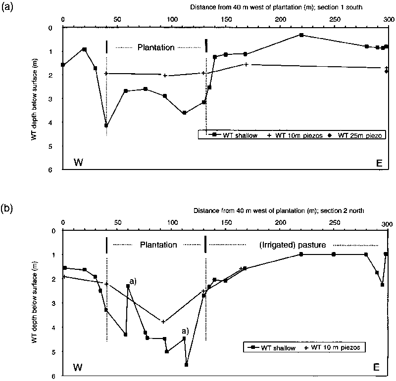 Figs. 6a and 6b show July 1995 water table and piezometer levels for the two sections through the plantation. The water table levels in the adjoining paddocks are clearly lowered by the tree plantation, however its impact only extended about 50 m into the irrigated pasture. Water table levels in Section 2 north are shown in Figure 6b. As the four bores inside the plantation in this Section were found to be permanently dry during the early stage of the monitoring programme, deeper bores (down to 6 m) were installed at the same locations in late 1984. At two of the four locations the water table levels measured in the deeper bores were below the bottom of the shallower dry bores. At the two other sites however (indicated with a) in Figure 6b), much shallower levels were found in the deeper bore, clearly illustrating the existence of an upward hydraulic gradient in the profile under the trees at these locations.