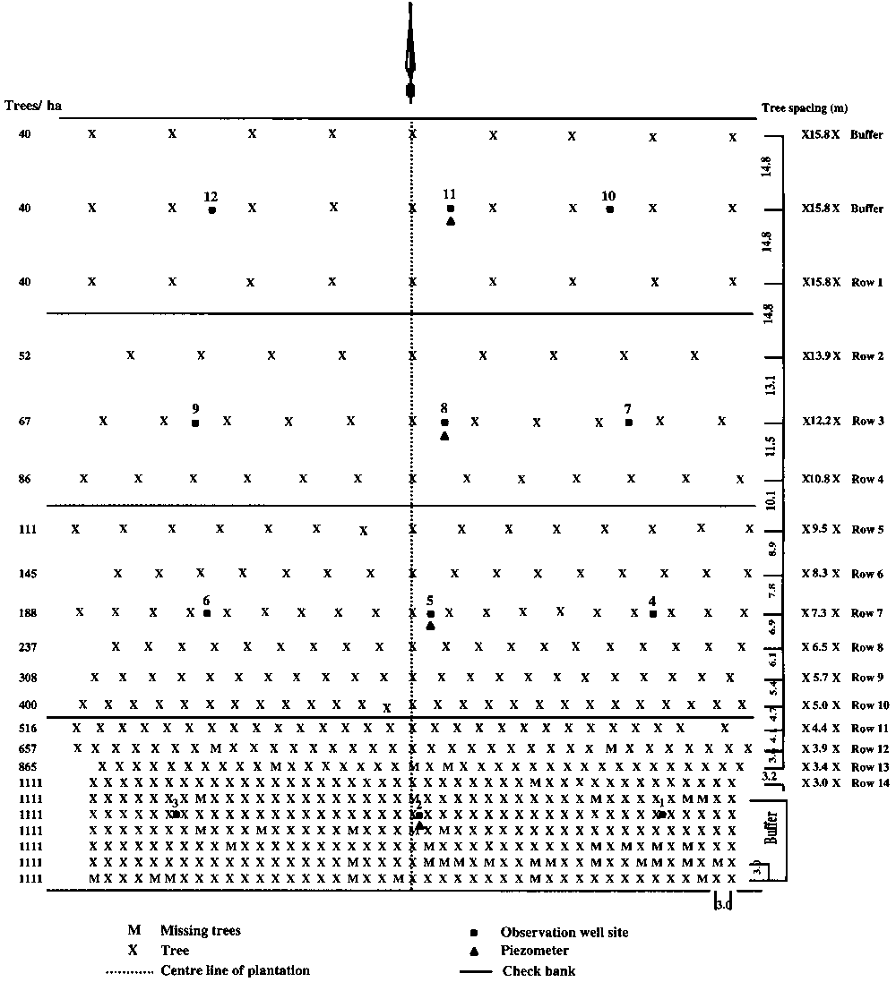 Figure 11 shows the trial layout. Tree density ranged from 40 to 1 110 trees/ha. Specific tree densities are shown in the figure. The site was sub-divided into four irrigation border strips, each 40 m wide. A pasture mix of perennial ryegrass (Lolium perenne) and white clover (Trifolium repens) was sown between the trees. Water table levels were measured in a series of 12 observation wells installed at four different tree densities. Piezometric levels were measured in 10 m deep piezometers, installed in the centre of the plantation at each of the four tree densities. Monthly measurements commenced in early 1986, one year after planting.