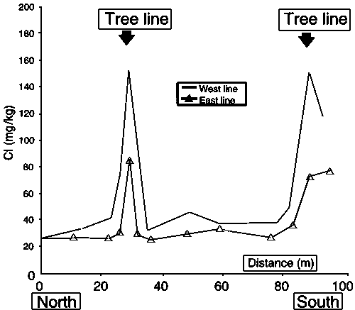 Figure 16 summarizes the chloride profile results at Site 1. Average chloride concentrations in the soil profiles along the two observation sections were determined by calculating the mean weighted average Cl concentrations down to 270 cm. Obvious peaks, although of a different order of magnitude for each section, are located under both the north and the south tree lines. The highest chloride concentrations (about 400 mg/kg) were found at a depth of 5 m, about 0.5 m above the level of the shallowest measured water table.