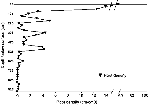 Root distribution was measured in core samples taken to a depth of 10 m. After washing to remove the soil from the roots, total root length per 20 cm core increment was measured on a root scanner.