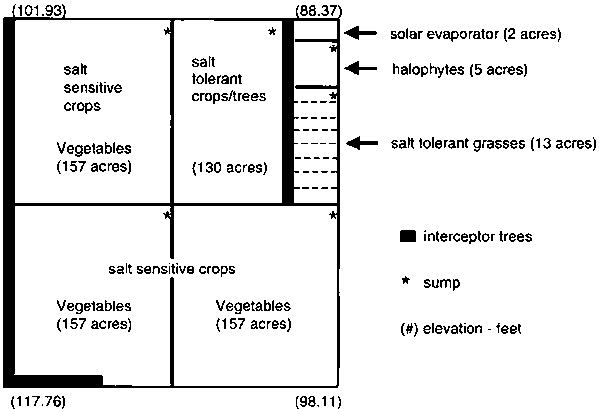 There are four salinity areas (zones) on the farm. Vegetable crops, grown in the non-saline zone covering 73.4 percent of the farm area, receive canal or well irrigation water. Alfalfa, cotton and other salt-tolerant commercial crops, grown on 20.3 percent of the farm in the low-saline zone, receive drainage water from the vegetable zone. Salt-tolerant grasses and trees, grown in the moderately-saline zone on 2.0 percent of the farm area, use drainage water from the salt-tolerant crops. At the last step of the sequential reuse, the grower applies saline water from salt tolerant grasses/trees to irrigate halophytes grown in the high-saline zone representing about 0.8 percent of the farm. This sequential water reuse process productively uses over 90 percent of the drainage water. The remaining drainage water goes into a solar evaporator where water is evaporated and salt is crystallized. The solar evaporator represents 0.3 percent of the total farm area.