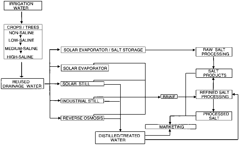 Basically, IFDM is an integrated bio- and conventional drainage salt management system. The saline water leached from the vegetable area moves through a sequential reuse of drainage water all the way to halophytes and the solar evaporator to harvest the salt. Salt utilization and marketing are the next stages of the project. Figure 26 illustrates the concept of salt management.