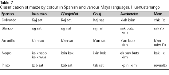 The people of Huehuetenango classify maize according to criteria such as colour, period of growth, shape of the grain, geographical origin and length of the growth cycle. By colour, maize is classified as white, yellow, black, coloured (red) and pinto (grains of different colours on the same cob resulting from cross-polination or transplants). Table 7 shows the terms used in Spanish and 5 local languages (Q'ajob'al, Chuj, Popti' [Jakalteko], Mam and Awakateko). Depending on the period of growth, summer maize is distinguished from winter maize. The shape and size of the grains serve to identify certain named varieties: pache (plump), long, dog tooth, etc. Due to geographical origin, there is a distinction between different types of maize: Comiteco (supposed to come from Comitán, Mexico), Chiapaneco (Chiapas, Mexico) and many others. Similarly, the maíz breve (quick maize) and maíz del año (maize of the year) owe their names to the time it takes to grow them.