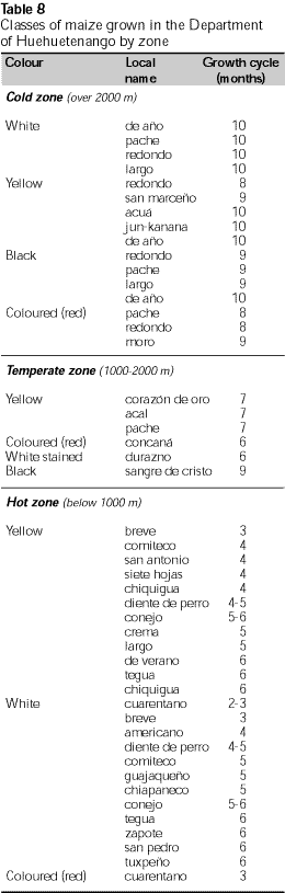 In Huehuetenango, 47 classes of maize have been identified. Table 8 lists the different varieties of maize identified in the study with their local names and by climatic zones. It also gives the data referring to the colour and growth cycles of the maize. In accordance with the social and historical dynamics of the Huehuetenango region, a high rate of exchange of maize seed between the different zones was recorded. For example, in the municipalities of Huista and in the north of the Department a yellow maize called Comiteco is grown which differs from the Tehua, and both these races of maize are abundantly present in Mexican territory.