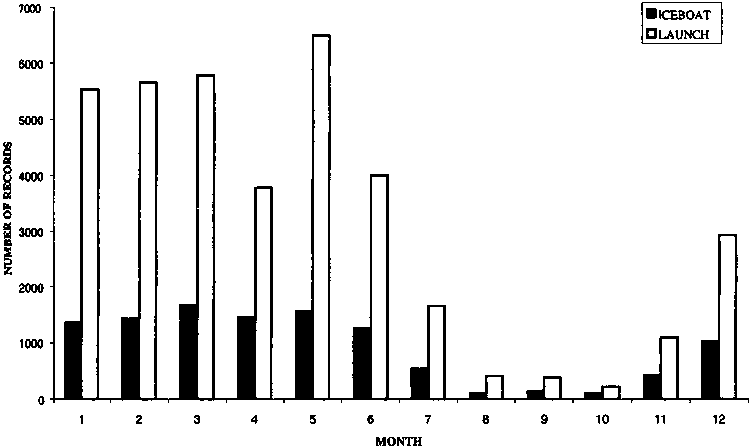 Figure 1 illustrates a slightly bimodal distribution in the number of iceboats records by vessel length. Figure 2 illustrates a normal distribution in the number of dayboat records by dayboat vessel lengths. Figures 3 and 4 use monthly values combined from all 6 seasons, to illustrate the well documented monthly pattern of flyingfish durng the course of a fishing season (note that in the graphs month 1 = October, see methods section). This seasonality is reflected both in terms of number of recorded landings (Fig. 3) and total catch weights (Fig. 4).