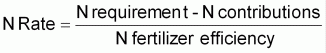 The fifth step is to select the expected N fertilizer recovery and divide the N requirement by the efficiency after having subtracted the different nitrogen contributions. This will result in the amount of fertilizer N needed to achieve the yield goal. Table 26.2 shows an example of these calculations.