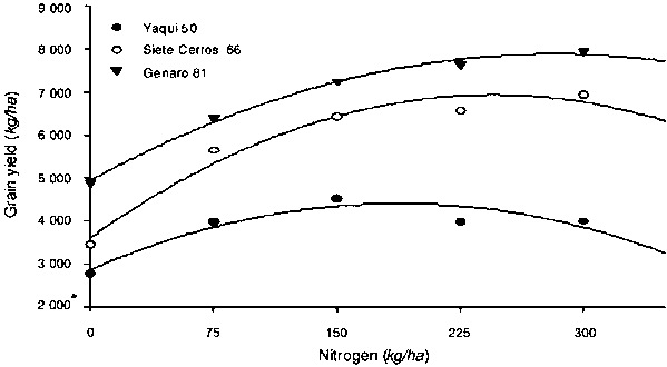 According to Moll et al. (1982), nitrogen-use efficiency (grain yield/N supplied) in cultivar development can be divided in two components: (i) uptake efficiency (plant total N/N supplied), which is the ability of the crop to extract nitrogen from the soil; and (ii) utilization efficiency (grain yield/plant total N), which measures the capacity of the plant to convert the already absorbed nitrogen in the plant into grain yield. One of the conditions for breeding nitrogen-use efficient wheat cultivars is the presence of genetic diversity for that trait. Genetic variability for nitrogen-use efficiency in wheat has been reported (Dhugga and Waines, 1989; van Sanford and MacKown, 1986; Ortiz-Monasterio et al., 1997). Furthermore, it has been shown that by breeding under medium to high N fertility conditions, the performance of CIMMYT's spring wheat cultivars from 1950 to 1985 has been improved when these are grown under high or low N fertility. In the semidwarfs, this increase in grain yield has been associated with gains in both components: uptake and utilization efficiency at the medium to high levels of N fertility and only with uptake efficiency under low N fertility (Ortiz-Monasterio et al., 1997). This suggests that the level of nitrogen in the soil plays a very important role in the genetic expression of uptake and utilization efficiency in wheat. At the low N levels, there is a better expression of uptake, while at high N levels in the soil, utilization is better expressed. This means that in theory the nitrogen level in the soil could be manipulated together with the genetic diversity of the crop as a breeding tool for the development of wheat cultivars with improved uptake and/or utilization efficiency (Ortiz-Monasterio et al., 1997). In the past, breeding for high yield potential in favourable environments (N not limiting) has produced germplasm with improved nitrogen-use efficiency when this is grown under low or high N fertility conditions in irrigated areas. It needs to be answered if other breeding strategies considering low N, or alternating low- and high-N environments during the selection of segregating populations and grain yield evaluations could result in germplasm with higher N-use efficiency.