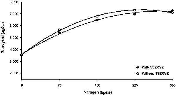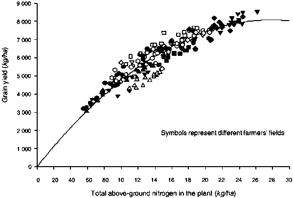 Relationship between wheat grain yield and total above-ground nitrogen at maturity
