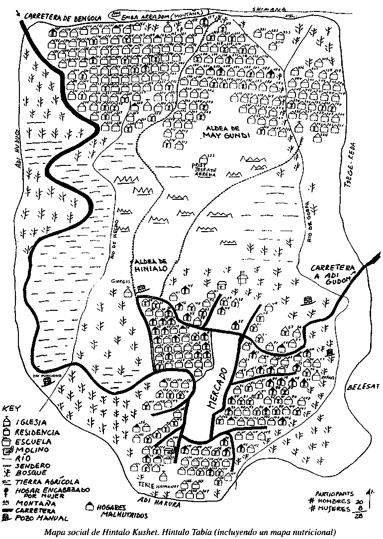 Puede llegar a saber quienes viven en la aldea trazando con la gente de la misma un mapa social de la aldea. Este mapa muestra las diferentes estructuras sociales, tales como hogares, centros de salud, escuelas, iglesias y otras instituciones importantes existentes en la zona. El mapa indica las características sociales y económicas de los hogares (p.e., menos pobres/pobres, encabezados por hombres/mujeres, etc.). Lo mejor es hacer un mapa social al comienzo de la evaluación, así puede proporcionarle información que tal vez necesite para otras evaluaciones, tales como la clasificación de riqueza, o el diagrama de Venn (que se explican más adelante).