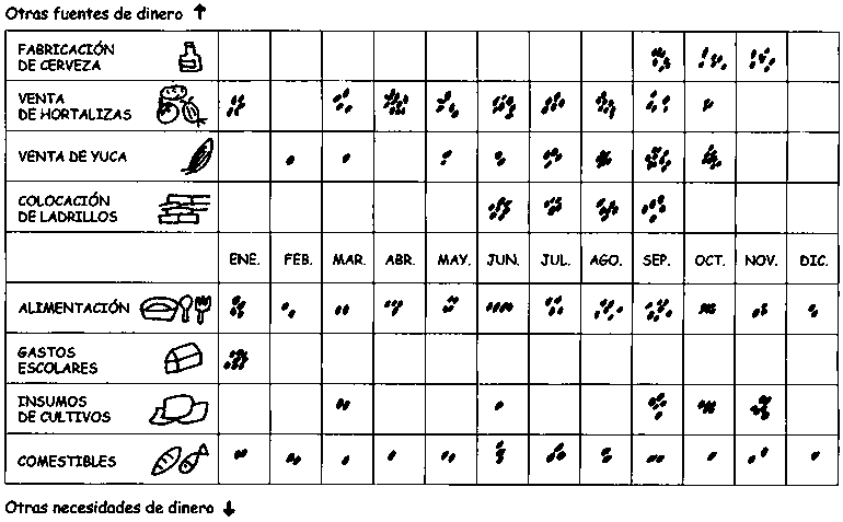 Las necesidades de dinero varían de un mes a otro, según las obligaciones de la familia, las necesidades de la estación de cosecha y siembra, etc. Un mejor conocimiento de estas variaciones estacionales ayudará a la gente a asignar y reservar sus recursos con mayor eficiencia para amortiguar los aumentos de las necesidades de consumo a lo largo del año.