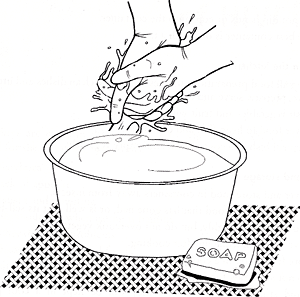 - Wash clothes, bedding and surfaces that might have been contaminated with faeces in hot water with soap.