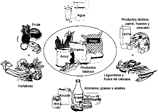 Estos alimentos son relativamente baratos y proporcionan no sólo energía y proteínas sino también pequeñas cantidades de vitaminas y minerales. Los alimentos básicos comprenden cereales (como arroz, maíz, mijo, sorgo, trigo y cebada), raíces amiláceas (como patatas, batatas, mandioca y ñame) y frutas amiláceas (como plátanos-vianda).