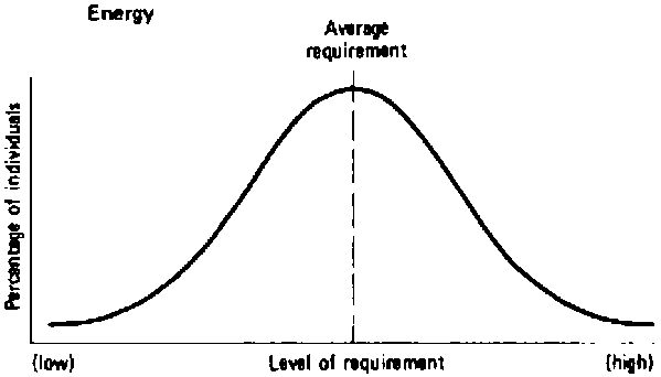The most crucial difference between the determination of energy and the other macro- and micronutrient requirements is that energy requirements must be presented as an average, that is, half the homogeneous population will be below the mean and half above, while the other requirements such as for protein were presented at the top end of the normal distribution of intakes or needs, at a level termed safe level of intake.