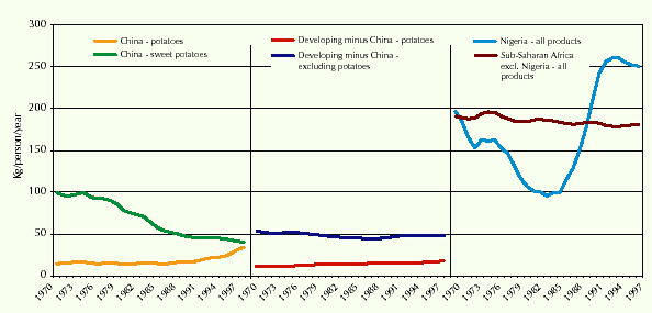 The preceding discussion reflects the current situation (average 1997/99) across different countries. The evolution over time shows declining per capita food consumption of starchy foods for the developing countries and the world as a whole up to about the late 1980s, followed by some recovery in the 1990s. These developments were a result of two main factors: