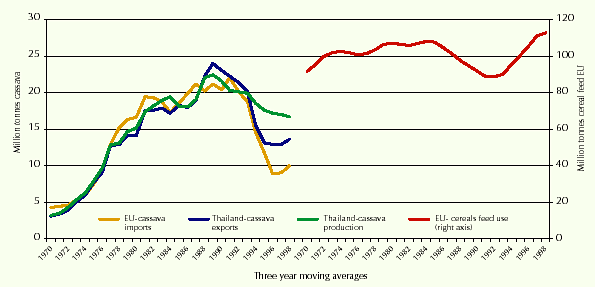 However, there are also several low food-intake countries that consume few starchy products, even though high proportions of their potential agricultural land are suitable for their rainfed cultivation. The explanation is probably to be found, at least in part, in the fact that even higher proportions are suitable for other more preferred crops, e.g. rice (Bangladesh, Cambodia and the Lao People's Democratic Republic) or maize (Zimbabwe and Kenya). Beyond that, the factors that contributed to the formation of traditional agricultural production patterns and present prevailing food consumption habits, probably explain why fairly similar agro-ecological conditions can result in widely differing diet preferences for starchy foods. This is most evident in Thailand which produces some 17 million tonnes of cassava but consumes only 4 percent of it as food (11 kg per capita), with the rest going to export as animal feed (see below).