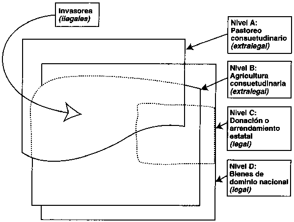 Es probable que los niveles de complejidad y conflictividad se agraven particularmente cuando, por ejemplo, se ha declarado oficialmente la propiedad estatal y se han otorgado donaciones o arrendamientos estatales sin consultar a los propietarios consuetudinarios (a quienes no se consideran como ilegales) y cuando los invasores se apropian de la tierra (véase la Figura 2). |