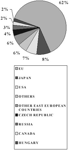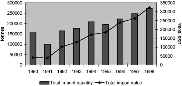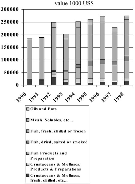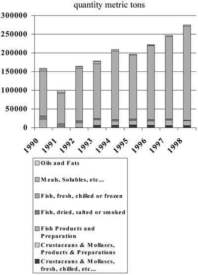In 1998 Poland was the 38th exporter, ranked by value, with exports of US$ 274 million. Despite the decline in production, the export level has fluctuated between about 130 000 t and 200 000 t, with a value in the range US$ 180 million to US$ 270 million, with no one year marking itself as exceptional. Imports, however, have increased steeply in both value and quantity, formed mainly by small pelagics from Norway.