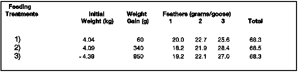Table 4 shows the results of another feeding trial in which Rhine and Guinea geese were compared. Both breeds were imported from France.