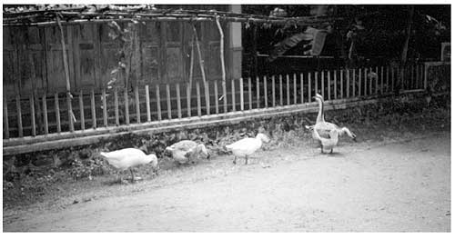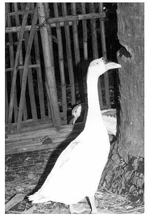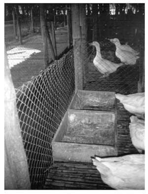 The yard or pen must have sloping floors because they are continuously washed by rain. A slatted floor must cover about one third of the area (wood or bamboo are adequate). This floor must be easily removable to clean underneath on a weekly base since this is where the geese droppings and any spilt feed fall because feeders are placed in this area (Figure 1). A thorough cleaning must be done regularly (e.g. every six months) and the feeders must be removed, and well-washed using a 10 percent solution of copper sulphate as a disinfectant. Care must be taken to avoid the geese coming into direct contact with the copper sulphate because of its toxicity.