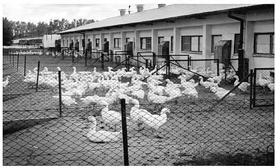 FIGURE 5. Building for the reproduction flock with darkened windows and trap-doors leading to the yard