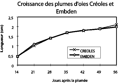 Un essai a été réalisé avec comme objectif de mesurer la vitesse de croissance des plumes de diverses parties du corps chez deux espèces: les oies Créoles et les oies d'Embden. Toutes les oies ont été plumées initialement et ensuite, la taille des plumes a été mesurée chaque semaine. Les résultats sont présentés en figure 8: la croissance des plumes est identique chez les deux souches d'oies. Il est intéressant de constater qu'après 56 jours, la croissance des plumes est nulle, ce qui indique le moment où il faut plumer. L'absence de sang au bout des plumes a permis de vérifier cette considération. L'autre enseignement de cet essai est que le rythme de poussée des plumes est identique sur toutes les parties du corps, ce qui permet de réaliser les plumées dans de bonnes conditions.