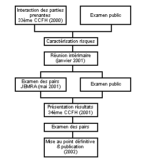 L'élaboration des évaluations des risques a donc duré deux ans et l'examen par les pairs un an de plus. Les projets de document ont été examinés à deux reprises par le CCFH et par deux Consultations mixtes FAO/OMS d'experts. En outre, l'examen par les pairs permettait de rassembler des observations techniques, et l'opinion du public a été sollicitée. Cette démarche rigoureuse a favorisé la transparence, ainsi que la participation de toutes les parties prenantes au processus.