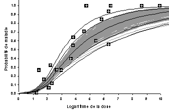 Il n'a pas été possible d'obtenir une seule courbe de meilleur ajustement, significative sur le plan statistique, à la valeur anticipée de tous les points des données épidémiologiques. Toutefois, la caractérisation des données épidémiologiques observées par le modèle dose-réponse ajusté était plus satisfaisante que celle d'autres modèles dose-réponse publiés. Il importe aussi de noter que la fourchette des réponses possibles à l'une quelconque des doses indiquées sur le fond de la figure 3 ne représente pas les limites de la confiance statistique de l'ajustement de la dose-réponse, mais plutôt le meilleur ajustement du modèle bêta-Poisson à différentes réalisations de la donnée observée, étant donné ses incertitudes.