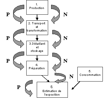 Figure 6. Description par module de la voie suivie par les poulets de chair entre la production et la consommation. Chaque étape décrit les changements qui s'opèrent au niveau de la prévalence (P) et du nombre de Salmonella (N) dans ce module particulier .