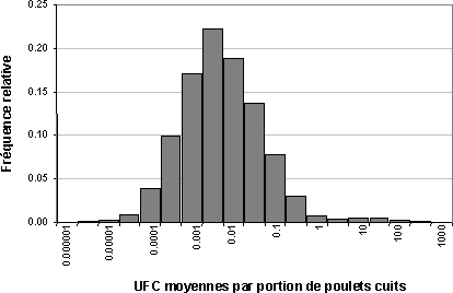 Au stade de la caractérisation, les résultats de l'évaluation des risques étaient associés au modèle dose-réponse pour obtenir deux estimations du risque: le risque par portion et le risque par contamination croisée. Les estimations de risque en ce qui concerne la probabilité de maladie étaient calculés tout d'abord en utilisant une prévalence donnée de la présence de Salmonella dans les poulets de chair crus congelés. Á un niveau de prévalence de 20% de carcasses contaminées (le cas de référence), et sur la base des autres paramètres du modèle, y compris la probabilité que le produit manque de cuisson, approximativement 2% des poulets de chair préparés pour consommation domestique peuvent contenir des cellules viables de Salmonella. La Figure 6 montre une distribution des doses moyennes (unité formant colonie (UFC)) par portion pour les poulets contaminés qui, par la suite, sont mal cuits.