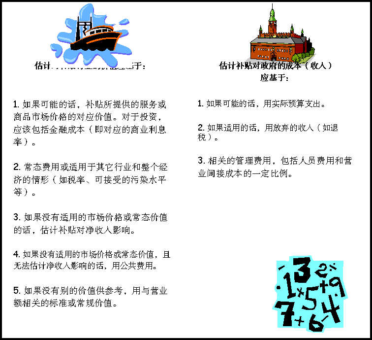 首先需要阐明对政府的成本(或收入)和对行业的价值的概念。《指南》对补贴的定义立足于一项补贴对企业利润的影响,因此某项补贴对行业的价值可以定义为由于该项补贴造成的行业利润率的变化。补贴对政府的价值与对行业的价值不同,对政府的价值可以定义为由于实行和管理补贴所发生的公共支出(包括直接和间接管理费用)。因此,某项补贴对政府的成本(或收入,如果是负补贴)和对行业的价值可能不相等。为了理解某项补贴的经济价值,需要从政府和行业两个方面进行分析。
