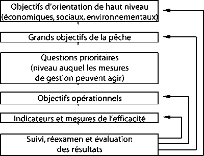 Les pratiques actuelles de gestion consistant à planifier, fixer des objectifs, appliquer des stratégies et des mesures pour atteindre les objectifs et à suivre et évaluer les résultats, si elle atteignent un niveau dexigence satisfaisant, resteront une bonne base pour la mise en oeuvre de lapproche écosystémique. Toutefois, compte tenu des intérêts socioéconomiques des parties intéressées définis plus largement dans le cadre de cette approche, il faudra, pour la fixation des objectifs socioéconomiques, tenir davantage compte que lon ne le fait à présent des valeurs et contraintes écologiques. La base des parties intéressées devra être élargie, la participation renforcée et les liens améliorés entre la gestion des pêcheries et laménagement des côtes et des océans et la gestion intégrées des zones côtières (voir le chapitre 4).