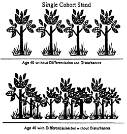 In the diagram, two stand structures from single cohort origins demonstrate stand development with and without differentiation with completely different vertical structure. With single cohort systems that manage stratified mixtures, development processes must be studied carefully to determine the appropriate integration with cultural systems. The development processes of stratified mixtures of species takes place with differentiation of trees according to height is into different horizontal strata or stories, one above the other, with one species or a group of species in each stratum. The differentiation is not simply into crown classes within a single canopy stratum as in single cohort stands without differentiation and disturbances. With the inclusion of disturbances, stand development processes will follow a pattern discussed under multicohort.