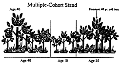 Uneven aged: contains at least three different age classes intermingled intimately on the same geographic area.