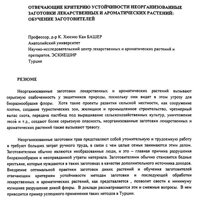 La récolte sauvage d'herbes est un travail laborieux et difficile qui ne peut se faire qu'à la main, ce qui fait que parfois une famille entière est employée à cette activité. Les cueilleurs n'ont généralement aucune instruction et c'est la principale cause de disparition de la biodiversité et de la perte, évitable, de plantes. Il s'agit de paysans pauvres qui ont ainsi une source supplémentaire de revenus. L'introduction de bonnes pratiques de récolte des plantes sauvages et l'éducation des cueilleurs, à qui on enseignera un mode de récolte assurant la pérennité des plantes et le traitement après la récolte des plantes médicinales et aromatiques, est considérée comme un bon moyen de réduire au minimum la destruction évitable de la flore. Le document traite de ces questions et des questions qui s'y rapportent. Un exemple réussi de ce genre d'éducation menée en Turquie sera présenté.