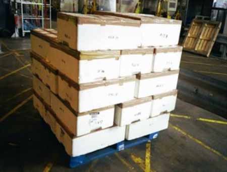 Smoked fish arrive packaged in cardboard or polystyrene boxes. Each box contains between 12 - 25 kg of smoked fish. Boxes of herring are typically around 10 kg. Figure 5 shows typical packing of foodstuffs into air cargo containers. Figure 6 shows a consignment of smoked fish from Ghana recently arrived at Gatwick Airport.