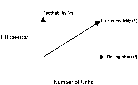 Figure 2.1 Fishing mortality (F) as a resultant of nominal fishing effort (f) and catchability (q). The number of units expresses nominal fishing effort, while catchability can be expressed by the efficiency of one unit of fishing effort