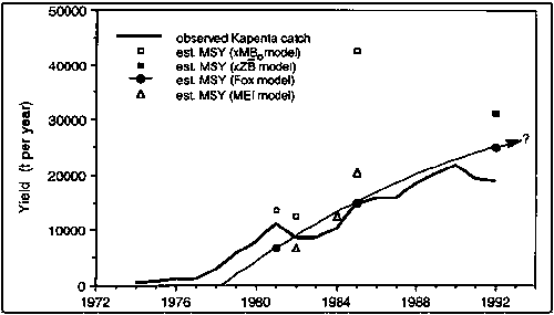 Box 5.2 Lake Kariba The Kapenta fishery on the Zimbabwean side of Lake Kariba experienced a decline in catch per unit effort during the late 1970s (Karenge and Kolding, 1995a), although the long-term trend is not significant. Fear of overfishing or indications of fully exploited resources have repeatedly been expressed in Lake Kariba (Marshall, 1981; Kenmuir, 1982; Marshall, 1985; Machena and Mabaye, 1987; Marshall and Langermann, 1988; Moyo, 1990), and it was commonly believed that the observed decline was due to overexploitation. However, these opinions have been contested (NORAD, 1985; Ramberg et al., 1987; Marshall, 1992; Kolding, 1994). Though decreased catch per unit effort and changes in species compositions sustained it, the notion of overexploitation appears to be based on inconsistent and misleading MSY calculations. Several of the attempts at calculating potential yields were based on the simple empirical equations of Gulland (1971), Henderson and Welcomme (1974) and Melack (1976). When comparing the result of these estimators, or when matching the predictions with the observed yield, large discrepancies are seen (Figure 5.2). Usually such discrepancies are explained by inadequacies in the data and/or various ad hoc hypotheses[18]. But the empirical equations are constructed from observed yield in various African lakes, irrespective of the fishing intensity level. In the early 1970s, when the correlations were made, yields may have been at their sustainable maximum, but judged upon later developments in most systems they most likely were not. Thus, the classic empirical equations only give an estimate of the observed mean yield in various systems in comparison with environmental parameters at the time of investigation. Theoretically, however, they say little about how far a fishery can expand in terms of sustainable yields. Figure 5.2 Observed Kapenta yield on the Zimbabwean side of Lake Kariba plotted against 4 groups of various MSY estimates.