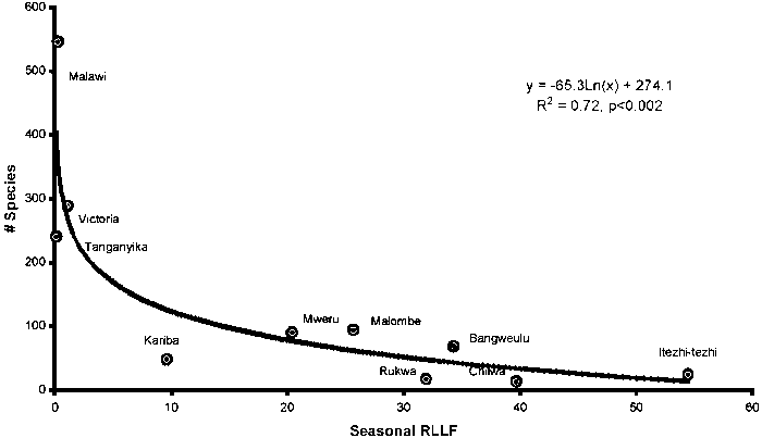 phenomenon during fish migrations. [18] A typical example of discrepancies are observed in Lake Tanganyika where the pelagic yields are many times the predicted value (see Coulter, 1991). [19] The problem is based on the difficulties in estimating the intrinsic growth rate (rm) in the underlying model from catch and effort data, since the true value of rm is only defined when the stock levels are extremely low (see eqn. 3 in Appendix 1, Box 1), in which case they would be seriously overfished. [20] This is apparently not the case in Malawi, where top-down processes through predation are thought to dampen effects of existing seasonality in lower trophic levels of the pelagic system (Allison et al., 1995), though this conclusion is based on rather short time series. [21] Comparisons between Lake Malawi and Lake Victoria over the past 1 200 years generally show opposite trends for both lakes consistent with the most typical patterns of rainfall anomalies, that show strong opposition between equatorial and southern Africa during most years (Nicholson, 1998a). [22] Note that mean depth can change considerably in these small lakes, which will affect the RLLF: in the case of Malombe we have chosen to take a mean depth averaged between periods of low and high water level. It will also affect the volume of the lake: with the two published average depth figures of 4m and 7m, the total volume of Malombe differs by a factor of almost 2! [23] However, bigger specimens may be able to escape the vagaries of abiotic variation as well by enduring mechanisms such as hibernation or migration. [24] But not over each and every species within these systems - see below. [25] Parental care is also a function of variable environment and circumstances of low oxygen content. [26] The phenotypic ability to start reproducing at a much smaller size than would be the case under more favourable conditions. [27] This has also been found in larger ecosystems such as the North Sea with all fisheries combined. [28] Though less so in the total daily multispecies catch (Oostenbrugge et al., in prep.) [29] In the data examined this was also due to an uncertain definition of effort. [30] This daily variability is extremely high: by comparison, a small-scale gillnet fisherman generally experiences a daily detrended and deseasonalized CV = 50%-70% (Densen, 2001; Zwieten, et al. 2002a). |