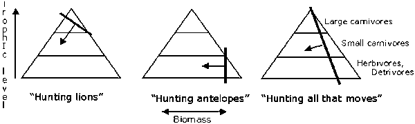 Figure 5.5 The trophic levels in a community at which a fishery intervenes. Triangles represent trophic pyramids of animal communities with predators at the apex and animals feeding on primary production and detritus at the bottom. The width of the triangle at any level represents the relative biomass of that level. Black lines represent selective exploitation, arrows the direction of increased pressure. The three triangles could each represent a different fishery, for example: a sport fishery on tigerfish (Hunting lions), a gillnet fishery on tilapiine fishes such as the Oreochromis fishery in Mweru comparable to grazers in wildlife (Hunting antelopes) and a fully developed fishery in which all trophic levels are harvested proportionally to their biomass (Hunting all that moves).