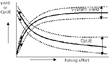 However, this does not mean that increasing effort is without problems. Increased effort, population-driven or otherwise, invariably leads to decreasing catches per fishing unit (CpUE) (Figure 5.8). Some fish species, found mainly but not exclusively in constant systems, will be more susceptible to fishing pressure (Tables 5.3, 5.4). As an overall harvesting pattern of a fish community where the fishing mortality is strictly proportional to the natural mortality of its constituent species probably does not exist, selection will take place. Increased reliance on the smaller species or the smaller, juvenile, segments of a fish community leads to increased variability in the catch of individual species[28]. This is caused both by the natural mortality patterns of the smaller species as they follow the boom and bust periods in variable systems, and as a result of a decreasing overall biomass. The time series of catch rates of the industrial fishery of Lake Tanganyika, described in Box 5.3 shows this, while this is also an example of option (1) of the choices for catch stabilization through spatial aggregation.