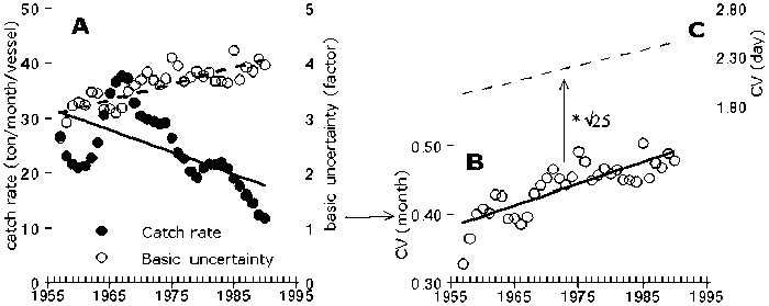 Box 5.3 Development in catch rates of the industrial pelagic fishery of Lake Tanganyika: one reason for its collapse Figure 5.9 A. Catch rates (closed circles and continuous line) and basic uncertainty (open circles and broken line) from 1956 to 1992 (five-year moving averages). Basic uncertainty is the variation excluding effects of the long-term trend and seasonality, expressed as a factor around the mean: for example the monthly average catch in 1990 was 11.7, the factor 4.0. So, catch rates varied randomly over this five-year period between 2.9 and 46.8 ton/month/vessel (see Zwieten and Njaya, 2003); B. Monthly variability (CV) per vessel in catch rates of this fishery based on Figure 5.9A.; C. Estimate of the day-to-day variability of a single vessel, by multiplying the monthly CV by vn, where n = 25, is the average number of days per month a fishing vessel goes out.