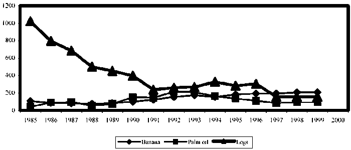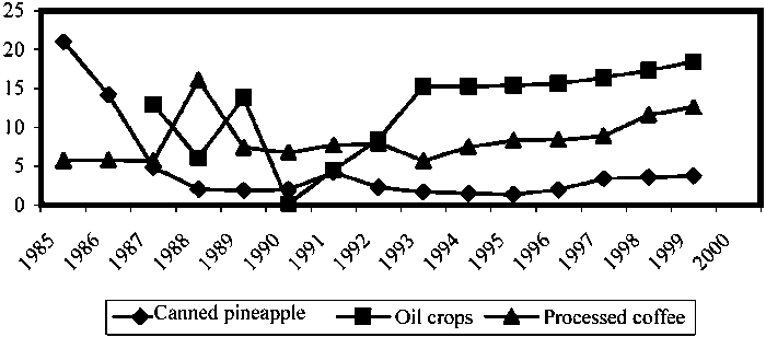 The same pattern is observed for rubber but not for banana or pineapple. The growth rate of the production of rubber fell from 11.4 percent in 1985-1989 to 5 percent in 1990-1994 as a consequence of the fall in the index of the world price from 100 in 1985 to 86.4 in 1989 and 33.9 in 1993. The growth rate recovered to 7.5 percent in 1994-1999 as prices improved. In contrast, the production of banana and pineapple grew steadily from 2.4 percent and -13 percent, respectively, in 1985-1989 to 3.9 percent and 3.8 percent, respectively, in 1990-1994 and to 8.3 percent and 7.5 percent, respectively, in 1995-1999.