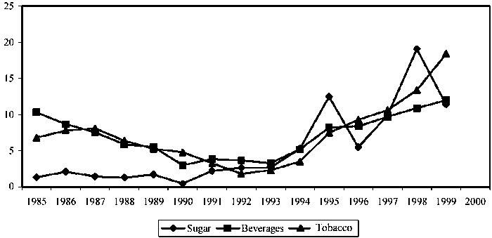 In 1995-1999, the import unit price situation was ambiguous as there was an equal split between prices that increased (wheat, beverages, tobacco, sugar) and those that fell (fish, rice, dairy products, fruit). On the one hand, the fall in the rice price, for example, as a result of the expansion of export subsidies by developed countries, is unfavourable to local farmers as it deters production. On the other hand, the decline of the import bills owing to the large import volume (not entirely offset by the anticipated increase of the import volume) would ease the balance of payments problems. Clearly, the trade-off should be in favour of the improvement in production incentives.