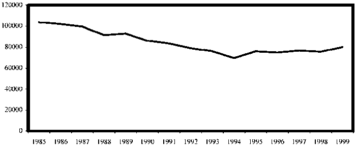 The volume of food expenditure declined by 1 percent annually on average in 1985-1994 but recovered by 5.2 percent during the period 1995-1999. These movements were due to the worsening and improvement, respectively, of the economic situation. Per capita food expenditure (Figure 8) declined by 4.2 percent in 1985-1994; its decline accelerated from 2.7 percent in 1985-1989 to 5.5 percent in 1990-1994 before rising to 3 percent annually in 1995-1999 for the same reasons already mentioned. In general terms, the food situation deteriorated between the two periods.