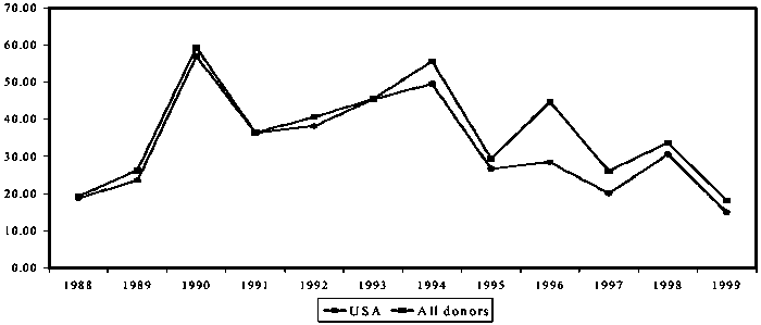Surprisingly enough, for years, Côte dIvoire received food aid (Figure 9) provided mainly by the US under PL 480. Food shipments increased from 15 509.3 tonnes in 1985-1989 to 47 530.2 in 1990-1994 and fell back to 30 487.6 in 1995-1999. Their annual rate of growth steadily declined from 36.7 percent in 1985-1989 to 26.5 percent in 1990-1994 and -10.8 percent in 1995-1999 (FAOSTAT, 2002).