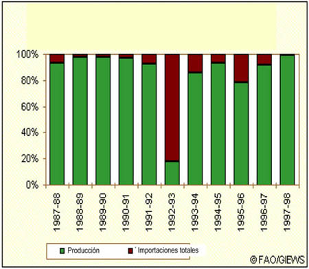 Figura 10. Proporción de la producción y las importaciones en el suministro de cereales en Zimbabwe